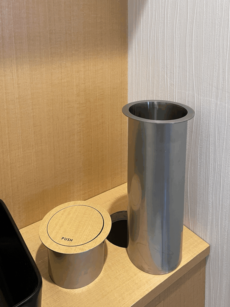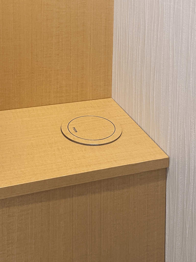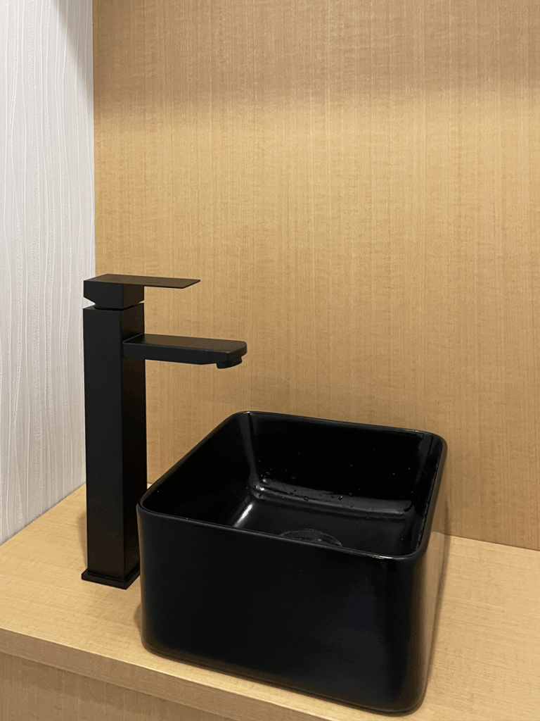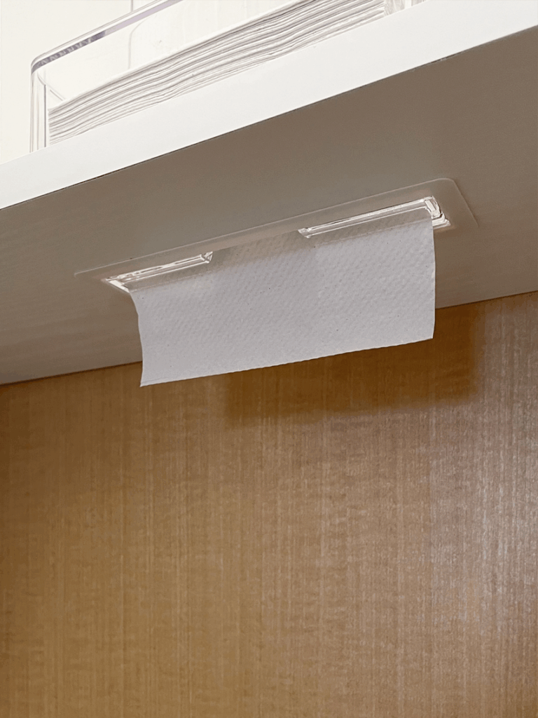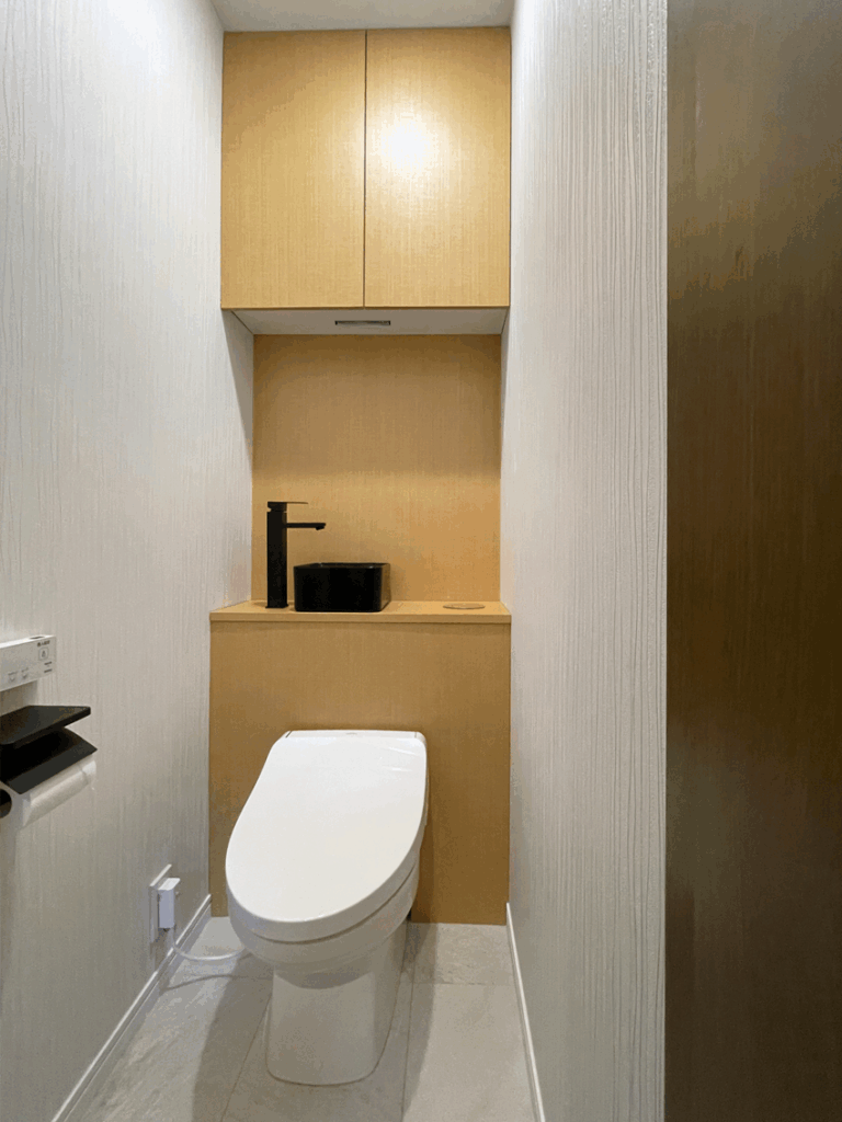 材料:18mmランバーコア(吊棚・天板)/6mmベニア(タンク手前カバー)/自動水栓装置/床・天井・壁、張り替え/手洗いボール・蛇口/ペーパータオル天井付け/埋め込み型ダストボックス/ほか